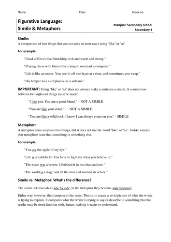 In an effort to provide you with as many resources as possible, this is the section reserved for activities to help students learn all about similes. This will help grow their writing technique similes and metaphors are the most commonly used figurative elements in writing. The similes worksheet gives a list of similes and metaphors. Start studying simile and metaphor worksheet 1. Integrating figures of speech such as similes into the teaching curriculum, will help our language learners enhance their understanding of the language in its entirety.